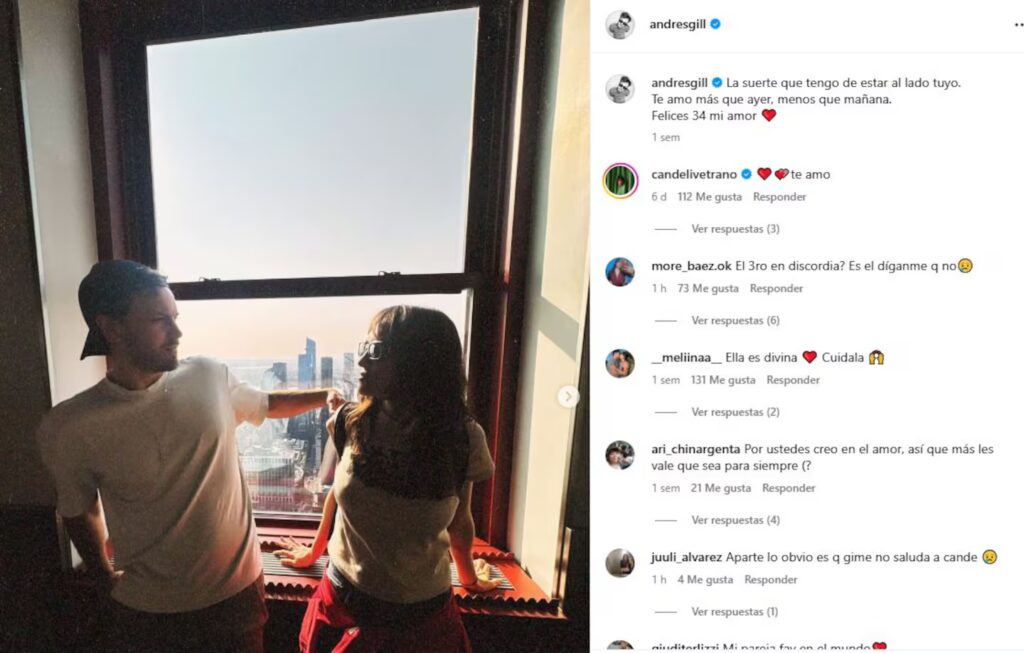 Mientras tanto, el propio Andrés Gil intentó despejar fantasmas de crisis con un tierno posteo en redes por el cumpleaños de su pareja: “La suerte que tengo de estar al lado tuyo. Te amo más que ayer, menos que mañana. Felices 34 mi amor”, escribió junto a imágenes juntos. La respuesta de Cande fue más escueta y generó aún más comentarios: un simple te amo. .