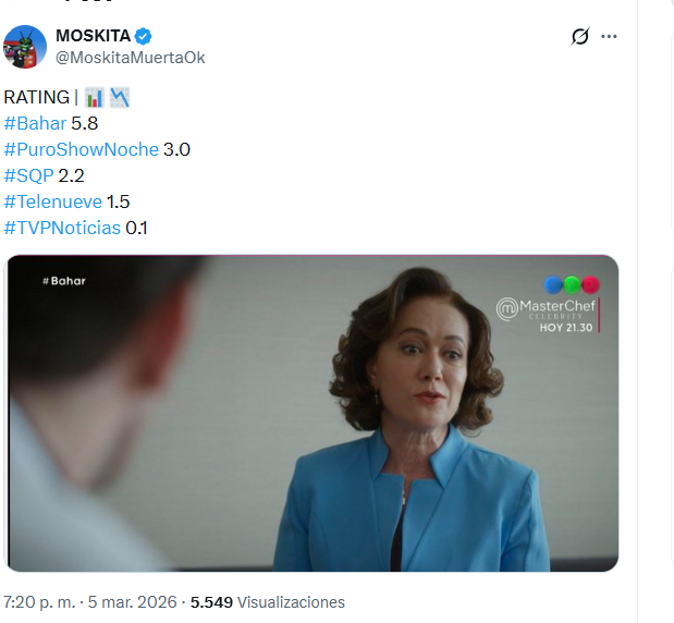 En tanto, el gran ganador de la tarde fue nuevamente Telefe, que se quedó con el liderazgo gracias a la novela turca “Bahar”, que alcanzó también 3.0 puntos de audiencia y se mantuvo como el programa más visto en ese horario.