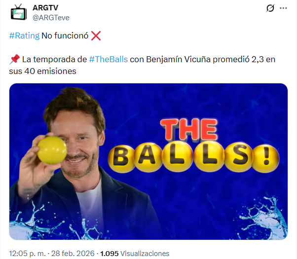 El movimiento más fuerte fue la salida de The Balls, el ciclo conducido por Benjamín Vicuña, que llegó a su fin luego de 40 emisiones. El programa, que había debutado en enero como parte de la grilla de verano, se despidió el 27 de febrero y no continuará al aire. Desde la señal aclararon que siempre se trató de un formato estacional, pensado exclusivamente para la temporada veraniega.