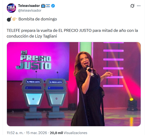 De acuerdo con la información difundida en redes, el proyecto podría concretarse hacia mitad de año. Desde la cuenta especializada afirmaron textualmente: “Bombita de domingo TELEFE prepara la vuelta de EL PRECIO JUSTO para mitad de año con la conducción de Lizy Tagliani”.