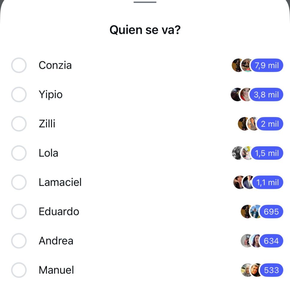 De acuerdo a ese relevamiento, Cinzia quedaría eliminada este lunes con casi 8 mil votos, una cifra que duplica ampliamente a Yipio, quien reúne cerca de 3.800 mil votos. Este cambio encendió las redes y dejó en evidencia que la definición será mucho más reñida de lo que se pensaba.