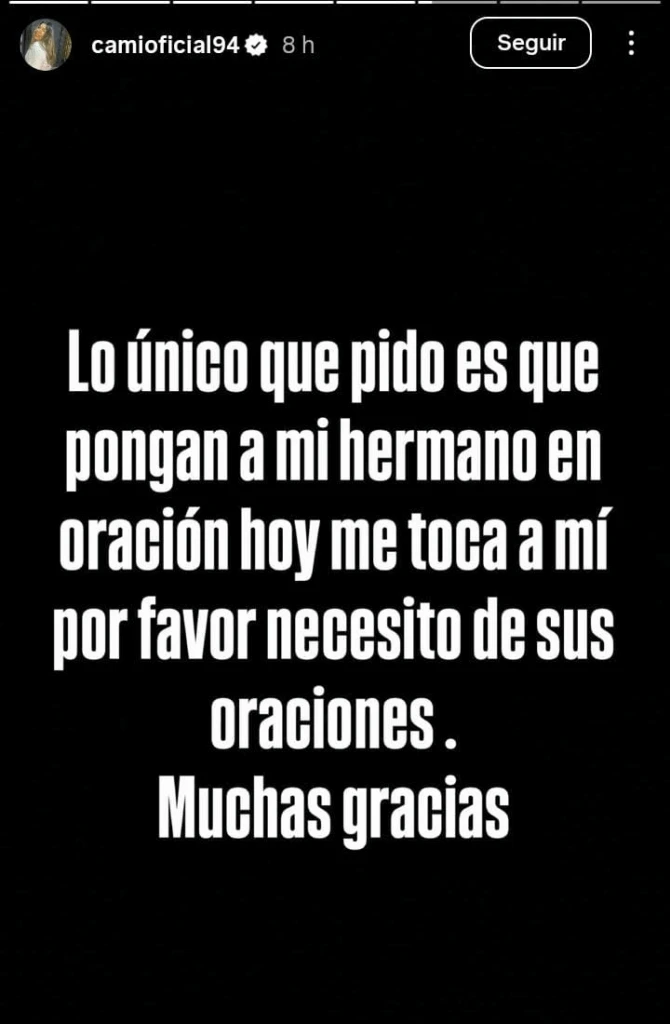 Antes de mostrar este gesto, Camilota había pedido que no decaigan las oraciones ni las buenas energías para la recuperación de su hermano. Con profunda preocupación, expresó: “Está atravesando un momento muy difícil de salud”.