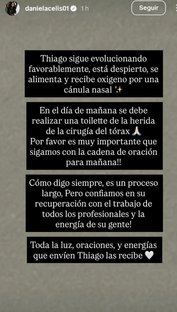 La ex participante del reality, además, volvió a pedir el apoyo de todos aquellos que vienen acompañando con mensajes y plegarias: “Por favor, es muy importante que sigamos con la cadena de oración para mañana. Confiamos en su recuperación con el trabajo de todos los profesionales y la energía de su gente. Toda la luz, oraciones y energías que envíen, Thiago las recibe”, imploró Daniela.