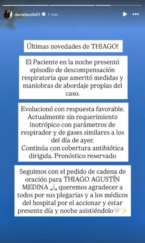 En paralelo, Daniela Celis, madre de las dos hijas de Thiago, utilizó sus redes sociales para expresar gratitud hacia los profesionales que lo atienden. En un posteo en Instagram, la ex Gran Hermano resaltó la dedicación de los doctores y del personal de salud que día y noche acompañan su recuperación. “¡Últimas novedades de THIAGO!