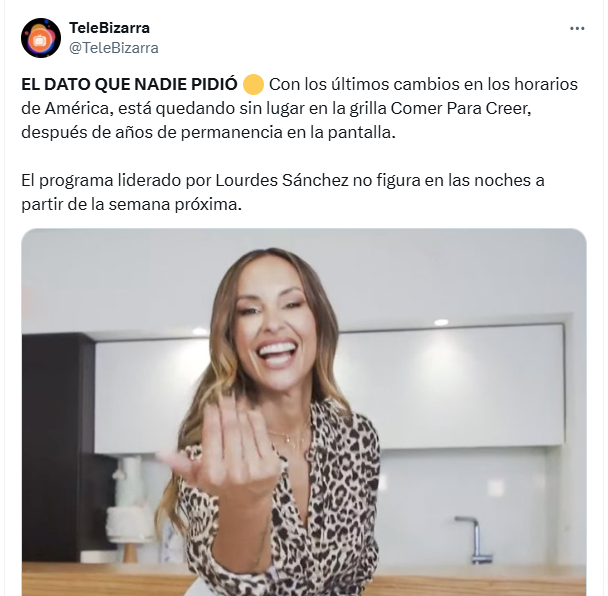 Con el paso de las semanas, la polémica se desinfló y el vínculo con Chato Prada se mostró intacto. Sin embargo, el presente volvió a darle un sacudón, esta vez en el plano laboral. Según trascendió en una cuenta especializada en televisión, América TV estaría a punto de dejarla fuera de la pantalla. El motivo sería la reestructuración de horarios en la señal, lo que impactaría de lleno en el ciclo que conducía: “Con los últimos cambios en los horarios de América, está quedando sin lugar en la grilla Comer Para Creer, después de años de permanencia en la pantalla”, señalaron en redes sociales, aludiendo a la supuesta cancelación del programa de cocina que se emitía a la medianoche.