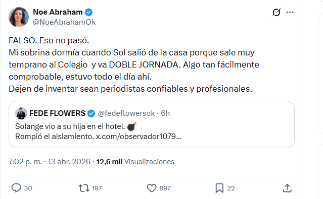 Frente al revuelo que tomó el tema, Noe Abraham, hermana de Sol, decidió romper el silencio con un contundente descargo en redes sociales: “FALSO. Eso no pasó. Mi sobrina dormía cuando Sol salió de la casa porque sale muy temprano al Colegio y va DOBLE JORNADA. Algo tan fácilmente comprobable, estuvo todo el día ahí. Dejen de inventar sean periodistas confiables y profesionales.”