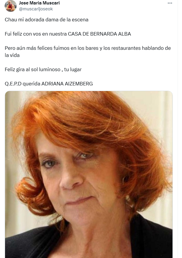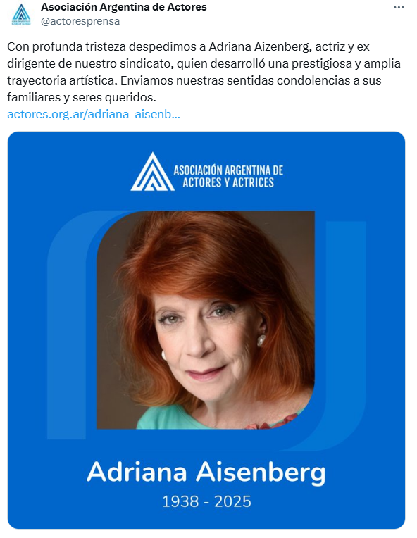 Desde su sindicato expresaron su profundo pesar: enviaron condolencias a la familia y subrayaron el impacto de su legado. La pérdida de Adriana Aizenberg es no solo la partida de una actriz consagrada, sino de una voz activa y comprometida que dejó una marca indeleble en el arte argentino.