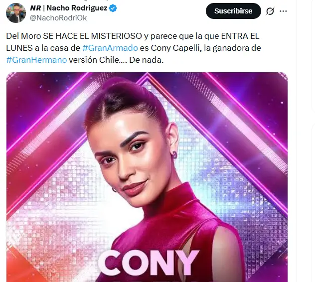 Mientras las teorías crecían minuto a minuto, un reconocido periodista decidió ir un paso más allá y revelar el nombre que, según su información, estaría detrás del anuncio. En redes publicó: “Del Moro SE HACE EL MISTERIOSO y parece que la que ENTRA EL LUNES a la casa de #GranArmado es Cony Capelli, la ganadora de #GranHermano versión Chile…. De nada”.