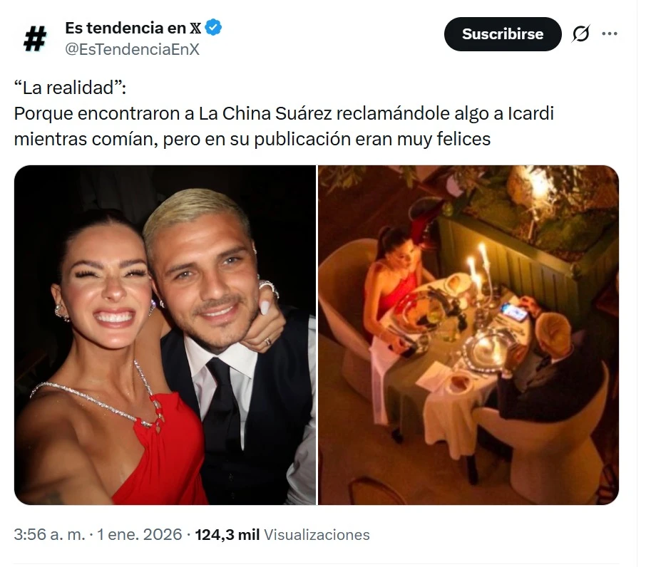 Bajo el título QUÉ SE ESCONDE DETRÁS DEL ROMANCE DE LA CHINA SUÁREZ Y MAURO ICARDI, la cuenta Es tendencia en X (@EsTendenciaEnX) fue contundente y escribió: “‘La realidad’: Porque encontraron a La China Suárez reclamándole algo a Icardi mientras comían, pero en su publicación eran muy felices”. A partir de allí, los comentarios no tardaron en multiplicarse.