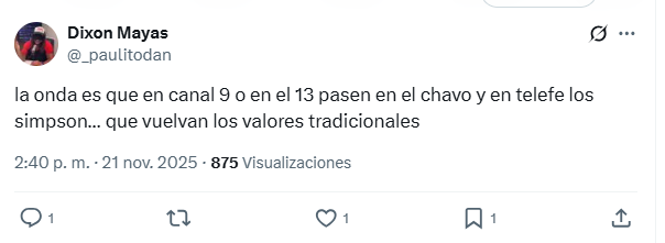 En redes sociales, la decisión encendió debates y memes, pero también algunos comentarios cargados de nostalgia y crítica. Entre ellos, cientos de usuarios reclamaron que se mantenga “lo de siempre”, dejando frases que reflejan el humor y la bronca del momento: “la onda es que en canal 9 o en el 13 pasen en el chavo y en telefe los simpson… que vuelvan los valores tradicionales” y “Si siguen así, muy pronto Los Simpsons en el trece”.