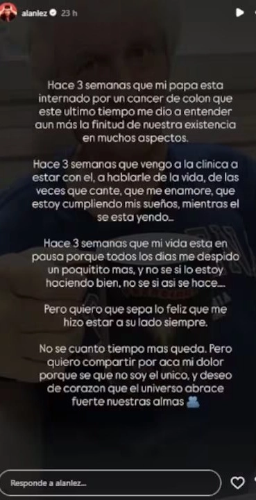 En sus historias de Instagram, Alan explicó la situación de salud de su papá con un mensaje que impactó de lleno a sus seguidores: “Mi papá está internado por un cáncer de colon que en este último tiempo me dio a entender aún más la finitud de nuestra existencia en muchos aspectos”.
