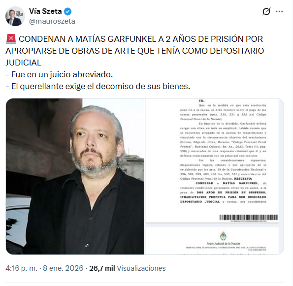 La información fue expuesta de manera directa y contundente por Szeta, quien escribió textualmente: «CONDENAN A MATÍAS GARFUNKEL A 2 AÑOS DE PRISIÓN POR APROPIARSE DE OBRAS DE ARTE QUE TENÍA COMO DEPOSITARIO JUDICIAL – Fue en un juicio abreviado. – El querellante exige el decomiso de sus bienes».