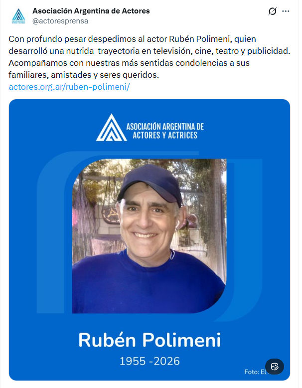 Desde la entidad emitieron un comunicado oficial en el que expresaron: “Con profundo pesar despedimos al actor Rubén Polimeni, quien desarrolló una nutrida trayectoria en televisión, cine, teatro y publicidad”. En el mismo mensaje, también hicieron llegar su acompañamiento “con las más sentidas condolencias a sus familiares, amistades y seres queridos”, reflejando el respeto que supo cosechar a lo largo de los años.