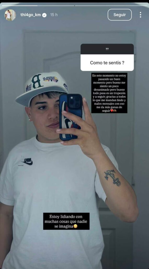 A través de sus historias de Instagram, Thiago confesó: “No estoy pasando un buen momento”, luego de recibir una consulta de un seguidor sobre cómo se sentía. Con una honestidad pocas veces vista, agregó: “Me siento un poco desanimado, pero bueno, todo pasa”.