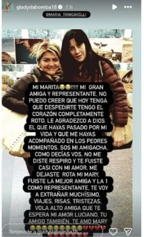 “Sos mi amigacha, como decías vos. No me diste respiro y te fuiste casi con mi amor. Me dejaste rota, mi Mary fuiste la mejor amiga, la número uno como representante. Te voy a extrañar muchísimo. Viajes, risas, tristezas. Volá alto, amiga, que te espera mi amor, Luciano. Te amo Mary”.