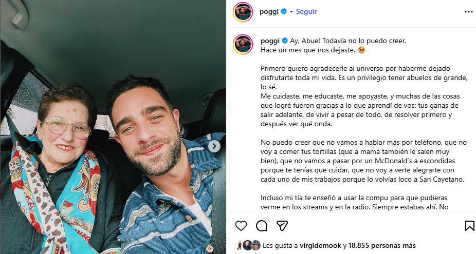 Con la cercanía que lo caracteriza frente a sus seguidores, Poggi expresó: “Ay, abue. Todavía no lo puedo creer. Hace un mes que nos dejaste. Primero quiero agradecerle al universo por haberme dejado disfrutarte toda mi vida“, iniciando un descargo que rápidamente conmovió a quienes lo acompañan en Instagram.