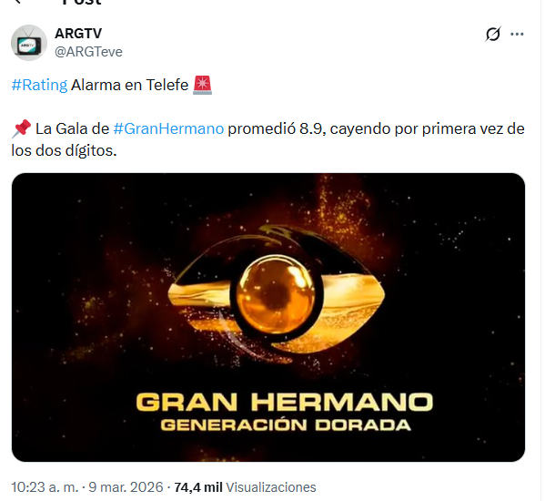 La Gala de #GranHermano promedió 8.9, cayendo por primera vez de los dos dígitos.”