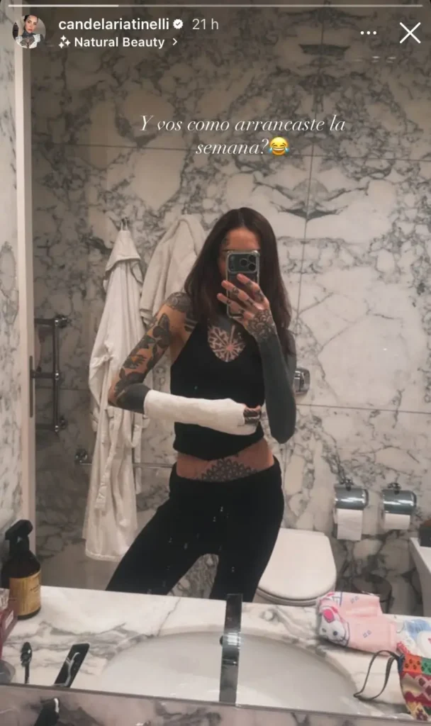 Pese al susto, Cande Tinelli optó por llevar tranquilidad a sus seguidores. Con su característico humor, publicó una historia en Instagram mostrando su brazo vendado y escribió: “¿Y vos, cómo arrancaste la semana?”. El mensaje, acompañado por un emoji risueño, fue su manera de demostrar que se encuentra de buen ánimo tras la intervención.