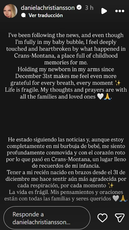 Con una placa negra publicada en sus historias de Instagram, Daniela manifestó su dolor por el devastador incendio ocurrido a fines de año en un sitio muy significativo para ella: Crans-Montana, un reconocido centro turístico de esquí en Suiza. Allí, según se informó, murieron más de 45 personas, un hecho que sacudió al país y al mundo entero. Para Christiansson, el impacto fue aún mayor, ya que se trata de un lugar donde creció y acumuló recuerdos imborrables de su infancia.