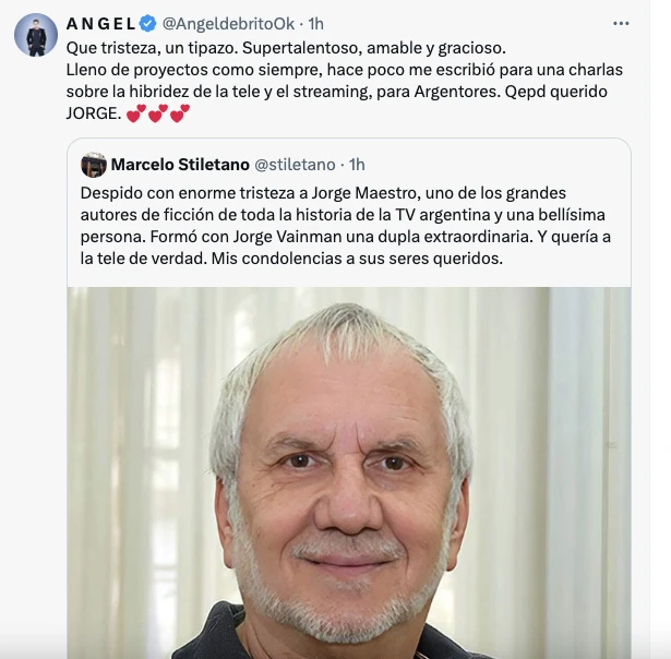 El periodista especializado en espectáculos Marcelo Stiletano también lo despidió con enorme respeto y afecto: “Despido con enorme tristeza a Jorge Maestro, uno de los grandes autores de ficción de toda la historia de la TV argentina y una bellísima persona. Formó con Jorge Vainman una dupla extraordinaria. Y quería a la tele de verdad. Mis condolencias a sus seres queridos”.