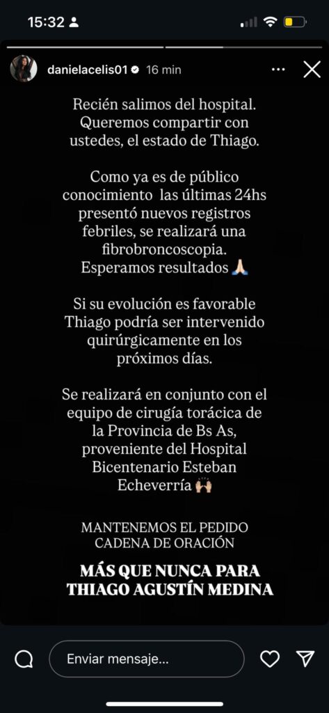 Conmovida y atenta a cada paso del proceso, Daniela recurrió a sus redes sociales para transmitir la información más reciente que entregó el equipo médico. En una storie de Instagram, expresó: “Recién salimos del hospital. Queremos compartir con ustedes el estado de Thiago. Como ya es de público conocimiento, las últimas veinticuatro horas presentó nuevos registros febriles, se realizará una fibrobroncoscopia”.