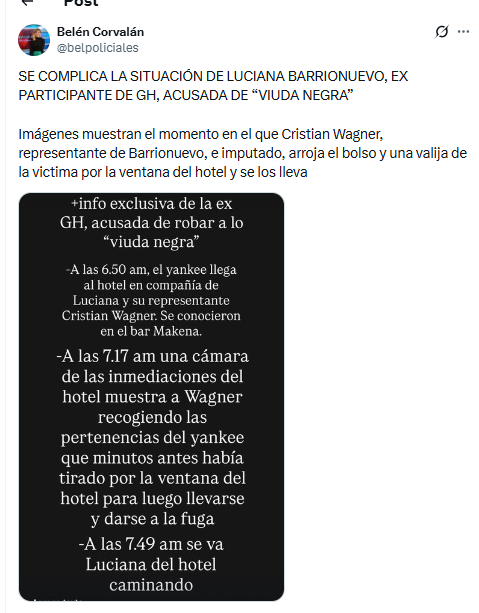 A través de su cuenta, la comunicadora aseguró: “SE COMPLICA LA SITUACIÓN DE LUCIANA BARRIONUEVO, EX PARTICIPANTE DE GH, ACUSADA DE “VIUDA NEGRA”.