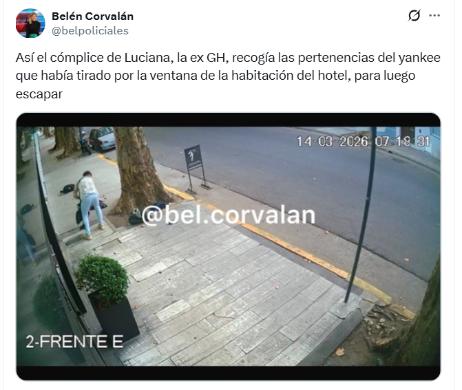 Minutos más tarde, la periodista compartió además una fotografía proveniente de las cámaras de seguridad que reforzaría esa versión. Junto a la imagen, escribió: “Así el cómplice de Luciana, la ex GH, recogía las pertenencias del yankee que había tirado por la ventana de la habitación del hotel, para luego escapar”.