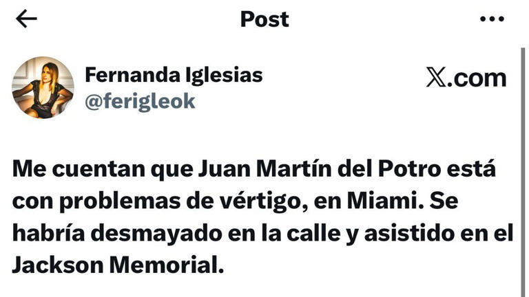 La periodista fue directa al comunicar lo que le habían informado: “Me cuentan que Juan Martín del Potro está con problemas de vértigo, en Miami. Se habría desmayado en la calle y asistido en el Jackson Memorial”. El mensaje no tardó en replicarse y generar repercusión, dado el cariño y la admiración que el ex número 3 del mundo despierta en el público.