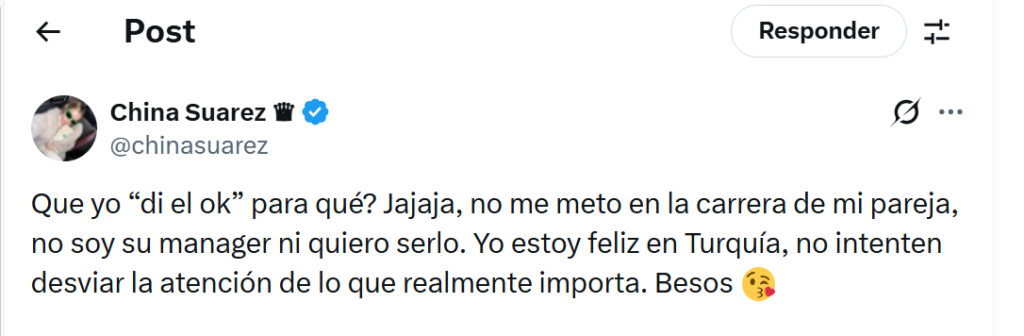 De manera contundente, expresó: “Que yo “di el ok” para qué? Jajaja, no me meto en la carrera de mi pareja, no soy su manager ni quiero serlo. Yo estoy feliz en Turquía, no intenten desviar la atención de lo que realmente importa. Besos”.