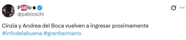 Quien terminó de encender la mecha fue uno de los analistas más seguidos del universo GH en redes. El usuario Pabloschi, conocido por anticipar eliminaciones con gran precisión, lanzó una afirmación que rápidamente se volvió viral: “Cinzia y Andrea del Boca vuelven a ingresar próximamente”.