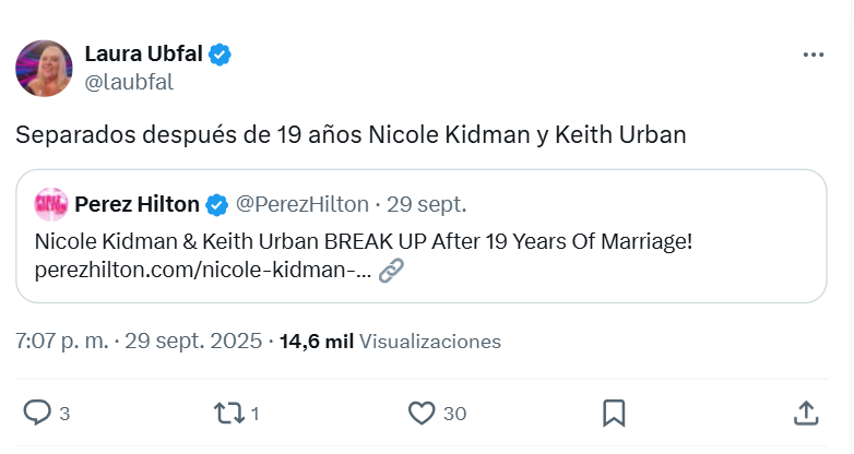 La primera en encender la mecha fue Laura Ubfal, quien recurrió a las redes sociales para dar la primicia y no dejó lugar a dudas con un mensaje contundente: “Separados después de 19 años Nicole Kidman y Keith Urban”.