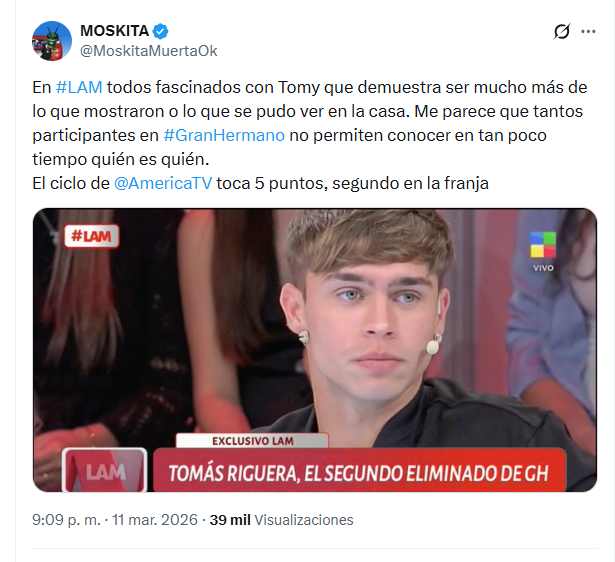 Por el lado de América TV, uno de los ciclos que logró destacarse fue LAM, el programa de espectáculos conducido por Ángel de Brito. El envío alcanzó un excelente pico de 5 puntos, impulsado por la presencia de Tomy, el último eliminado de Gran Hermano, cuya visita generó gran interés entre los fanáticos del reality.