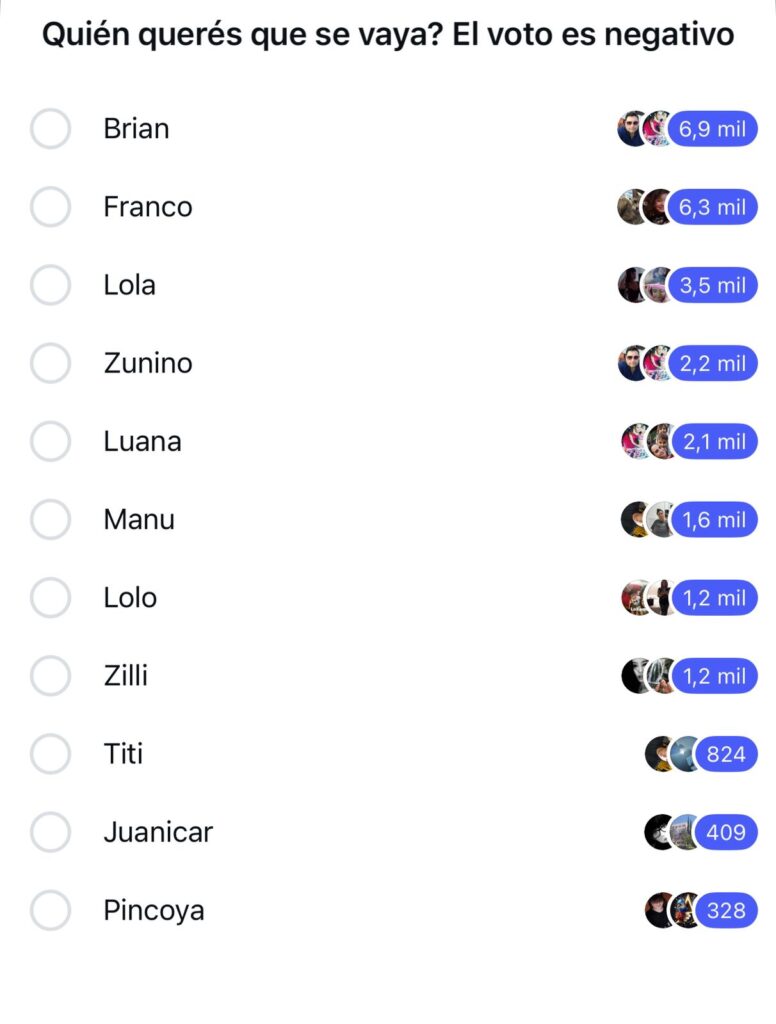 Según el relevamiento, Brian y Franco concentran la mayor cantidad de votos negativos y se posicionan como los principales candidatos a abandonar el reality. Muy por detrás aparece Lola, mientras que el resto de los nominados queda con cifras considerablemente menores.